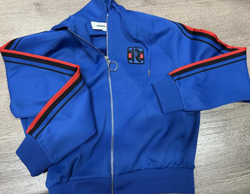 RABANNE H&M. Колаборація Спортивна кофта з щільної тканини джерсі з резиновою аплікацією у вигляді логотипа на грудях. Довгі рукава зі смужками по боках. Високий комір і двостороння блискавка спереду. Приховані бокові кишені. Є розмір М (46-48) , якісна змійка ykk., є також штани чорно кольору розмір S(M), однозначно цікаво і стильово..!