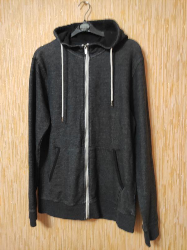 чоловіча олімпійка худі толстовка з капюшоном від фірми RQRD синьо-сірого кольору. Гарний стан, висока якість, без нюансів. Трикотаж щільний, без начоса, склад 60% бавовна+ 40% поліестр. Довжина 73см Напівоб'єм по грудях 56см Напівоб'єм по низу - 51см Довжина рукава 73см Ширина в плечах - 48см