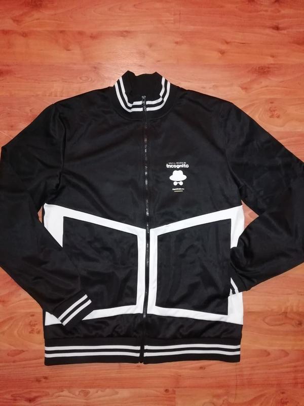 Спортивна кофта, чорна з білим, на блискавці, фліс. Плечі 49 див. Рукав 71 див. Об'єм грудей 110 див. Спина 45 див Довжина 74 див. Низ 50 див. Низ рукава 10 див.