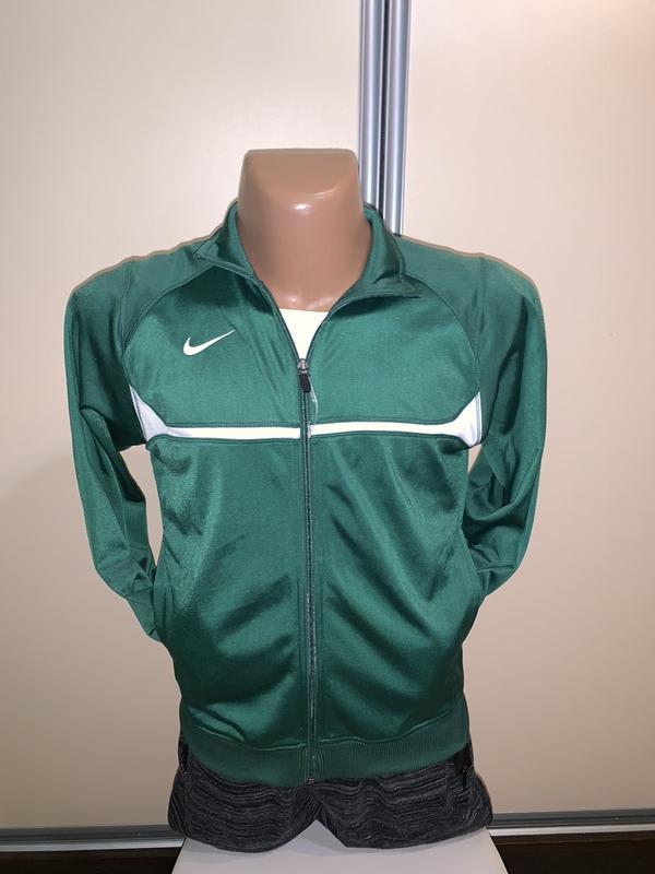 Нова олімпійка красивого зеленого кольору з білими вставками. Еластік. Тягнеться. Є 2 кишені. Низ і рукава на манжетах. Заміри: плечі 38, ПоГ 51, довжина 61, рукав 57