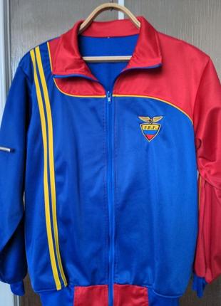 насичених червоного, синього кольорів виріб, прикрашене жовтими смугами. незвично і свіжо виглядають рукави: один червоний, другий синій. річ дуже в хорошому стані. розмір вказано M. виміри див. плечі 46, пахви 55, довжина по спинці 65, рукав від плеча 59.