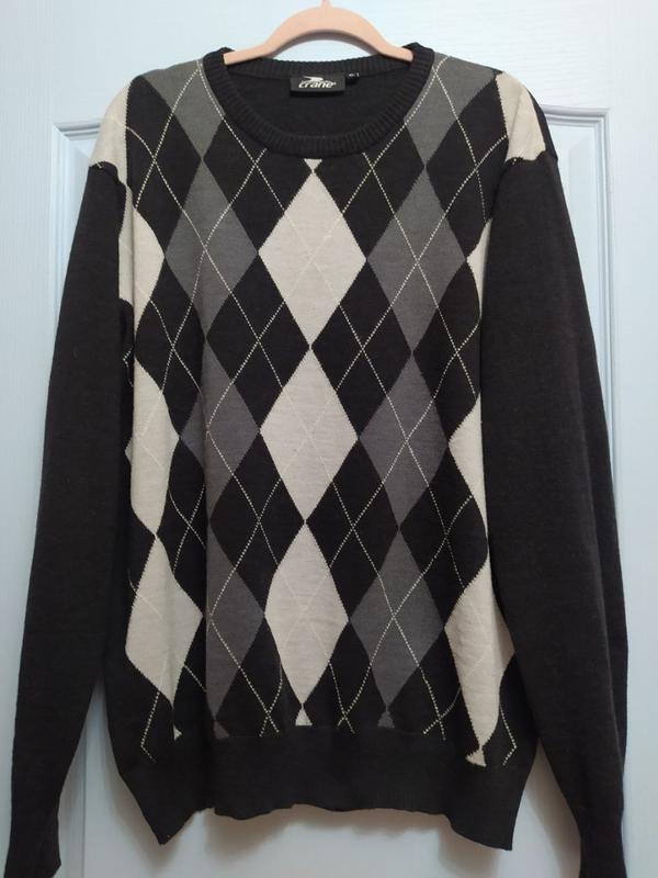 Кофта вінтажна в ідеальному стані,без ньюансів та дефектів. Не розтягнутий!!! Німецька якість бренду Crane 1971 року випуску. На даний час цей бренд випускає лише спортивний одяг з 2009 року. Трикотаж: шерсть 50,акріл 50,полотно тонке,але тепле. Основний колір чорний,ромби світло сірі та темно сірі. На бірці розмір ХЛ,але більшомірить,тому краще орієнтуватися на заміри. плечі 52 одне плече 16 груди півширини 63 рукав 66 довжина 72 Дбайливо випраний,випрасований,готовий до використання!