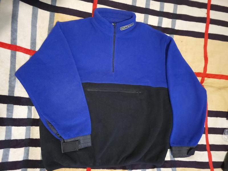 Дуже тепла фліска, темно-синього з чорним кольором (на фото світліший синій, не передається, і чорний глибокий). Спереду карман глибокий кенгуру, та по боках на змійках. Рукавчики регулюються липучкою. Стан ідеальний.
