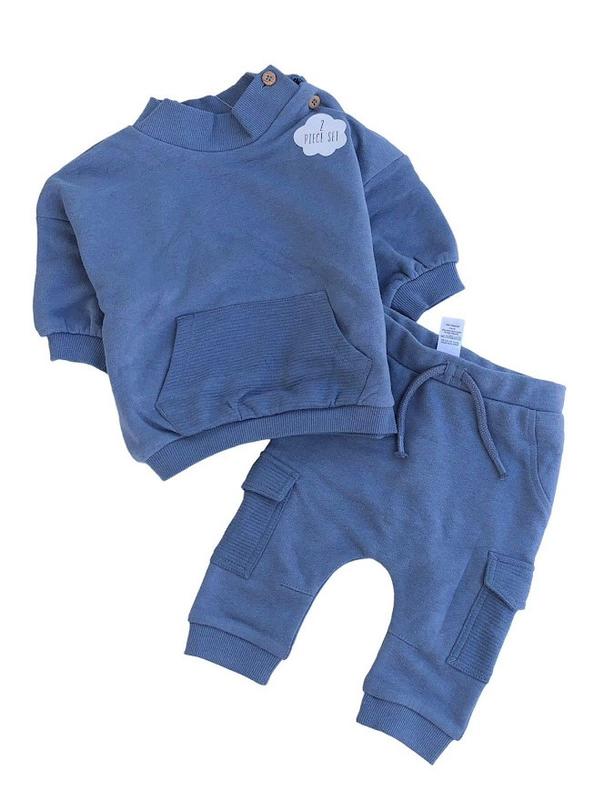 Зручний та комфортний костюм від якого ваш малюк буде у захваті. Дуже гарної якості, м'якенький та приємний до тіла. Костюм виконаний з матеріалу двунитка петля. Світшот на плечі застібається на гудзики, що суттєво полегшує процес переодягання. Горловина та манжети трикотажні. Спереду є накладна кишеня- кенгуру. Пояс штанів на резинці, штанини на манжеті. По бокам штанів є накладні кишені. Костюм відмінно підійде на прохолодний літній вечір або теплу весняно-осінню пору. Заміри: Світшот: довжина/рукав від шиї/обхват грудей Штани: довжина/пояс/обхват стегон/крок 56/62 см (0-3 міс): 33/27/66 см 33/40/50/14 см
