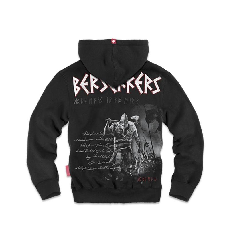 - Толстовка з бавовни високої щільності. - Модель із блискавкою, високим коміром та капюшоном. - Оброблена широкими трикотажними гумками. - Дві накладні кишені. - У капюшона шнурки та металеві кільця. - Графіка із зображенням вікінга-воїна, несучої сокири, а також рунічні символи і напис BERSERKERS. Дизайн одягу Dobermans Aggressive -- ось що є відмітною рисою бренда. уважність до дрібниць, оздоблення, принти та вишивки -- все це робить одяг Dobermans Aggressive не схожим на інший.