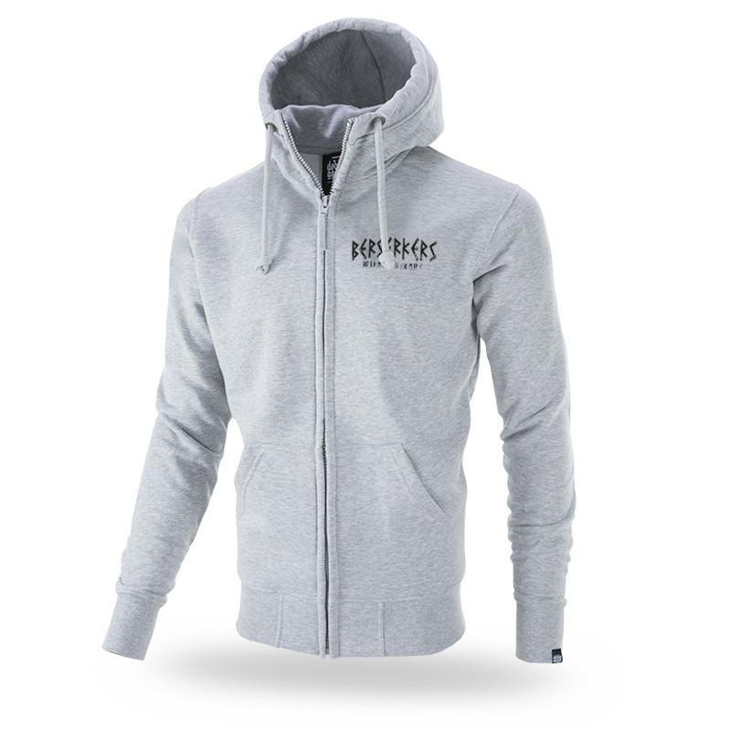Чоловіча толстовка сіра Dobermans Aggressive BZ99EGY худі на блискавці з капюшоном - Толстовка з бавовни високої щільності. - Модель із блискавкою, високим коміром та капюшоном. - Оброблена широкими трикотажними гумками. - Дві накладні кишені. - У капюшона шнурки та металеві кільця. - Графіка із зображенням вікінга-воїна, несучої сокири, а також рунічні символи. - Назва колекції повторюється на лівій стороні грудей як одноколірна вишивка, виготовлена прямо на матеріалі.