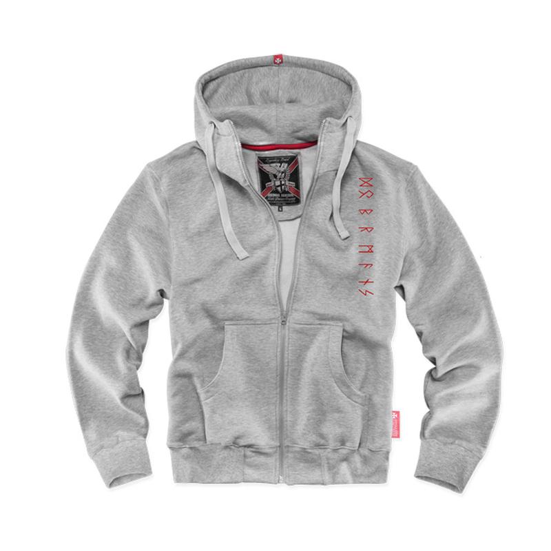 Чоловіча толстовка сіра Dobermans Aggressive BZ127GY худі на блискавці з капюшоном - Толстовка чоловіча з капюшоном і двома кишенями з чистої бавовни. - Високий комір. - Нижня частина та манжети оброблені трикотажною гумкою, у капюшона мотузки, металеві кільця та лейбл. - Принт із рунічних символів. - Двоколірна графіка, що зображує вікінга, що тримає сокиру. Вся представлена продукція в цьому розділі є результатом творчої діяльності дизайнерів бренда Dobermans Aggressive. Всі зображення, нанесені на вироби, не несуть політичного чи ідеологічного підплеювання. Символіка не входить до списку забороненої.