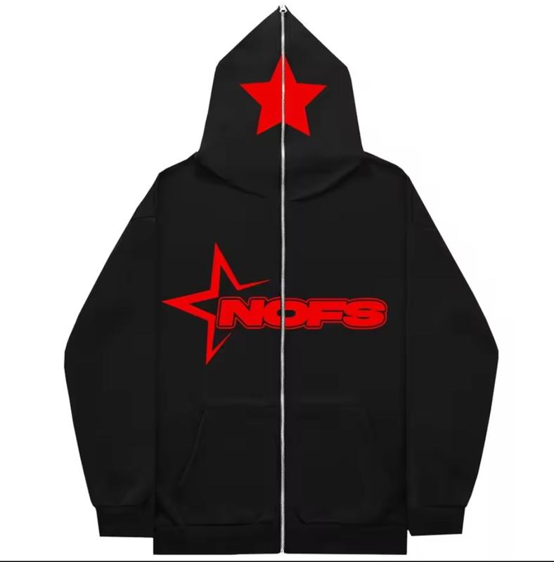 Толстовка з капюшоном "NOFS" з червоною зіркою Чорна толстовка на блискавці з ефектним дизайном для тих, хто цінує стиль та комфорт. На грудях виділяється напис "NOFS" з червоною зіркою, що символізує енергію та індивідуальність. Великий червоний принт зірки прикрашає каптур, додаючи унікальності вашому образу. Толстовка виконана з якісного бавовняного матеріалу, що забезпечує м'якість та комфорт у повсякденному носінні. Просторі кишені на передній стороні зручні для зберігання дрібниць чи зігрівання рук. Підійде для прогулянок, занять спортом чи активного відпочинку. Характеристики: - Матеріал: 80% бавовна, 20% поліестер. - Застібка: блискавка. - Колір: чорний із червоним принтом. - Універсальний стиль: підходить як для чоловіків, так і жінок. Ця толстовка стане чудовим доповненням до вашого гардеробу та підкреслить вашу унікальність!