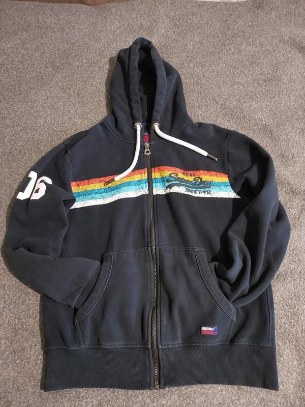 Продам класну толстовку з капюшоном на блискавці з вінтажним логотипом Superdry. Ця класична толстовка має капюшон на шнурку, дві передні кишені та смугасту вставку на грудях. Супер виглядає збоку. Єдиний нюанс малопомітні зачепи внизу, біля змійки (вказав на останньому фото), в іншому у відмінному стані. Оригінал. Супер якість.