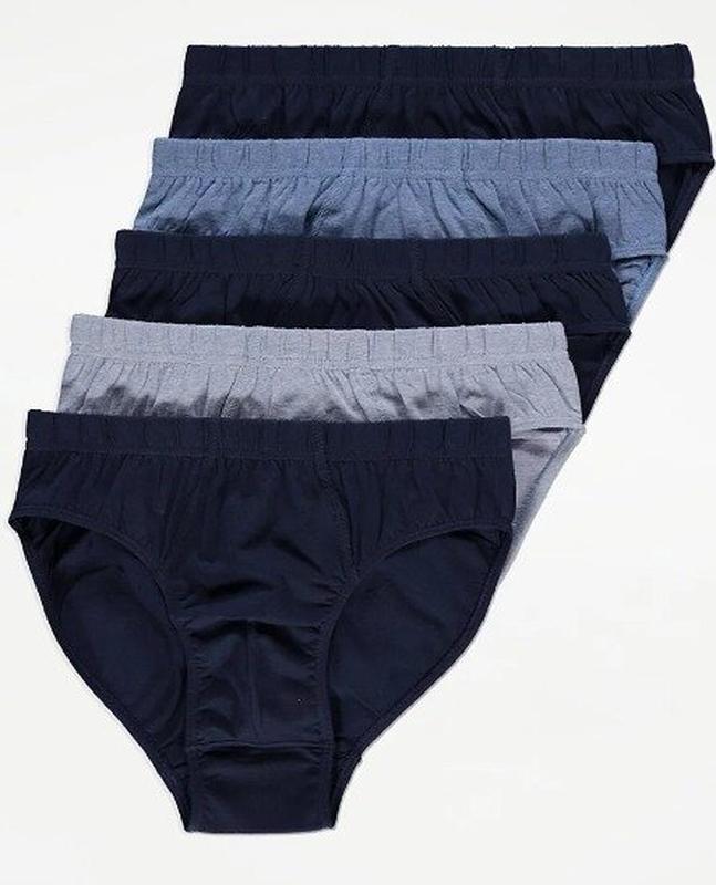 В упаковці 5 шт 3 синіх, 1 шт світло-блакитні та 1 шт. темно-блакитні 100% бавовна Розмір S 76-80 см ПО резинки 28, 29 см, висота 26, 27 см Розмір Л талія 92-97 см ПО резинки 36, 37 см, висота 29, 30 см
