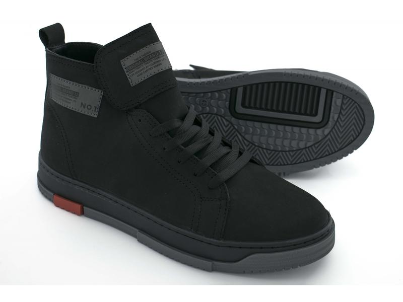 Оригинальные мужские ботинки в спортивном стиле. Обувь из мягкой и плотной, натуральной кожи - нубука, выполнена в черном цвете и утеплена шерстью.