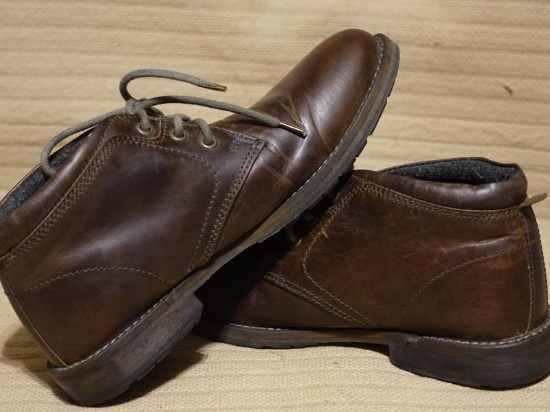 Продаються чудові шкіряні черевики-дезерти британського мультибренда Matalan, бренд чоловічого одягу та взуття Easy 1973. Це легкі шкіряні черевики, виготовлені в класичному стилі. Верх взуття — м'яка товста гладка натуральна шкіра шоколадного кольору. Язичок м'який, повністю шкіряний. Модель фіксується на нозі за допомогою 3 пар люверсів, через які протягнуті товсті об'ємні вощені круглі шнурки сталевого кольору. Усі деталі взуття відстрочені рівним подвійним швом міцними тонкими нитками коричневого кольору. Виворітна сторона дезертів обладнана м'якою баечкою сірого кольору. Устілка м'яка незнімна. Верх устілки — щільна м'яка тканина чорного кольору. У задній частині на устілці пришита шкіряна вставка з фірмовим маркуванням бренда. Взуття на стандартному складаному стійкому підборі. Підошва складається зі шкіряної міжпідошви та основної підошви. На лінії шкіряної міжпідошви шкіряний верх виробу надійно пришитий до підошви міцним товстими нитками контрастного бежевого кольору з утворенням характерного ранту. Основна підошва виготовлена з високоякісної зносостійкої рифленої гуми темно-коричневого кольору. Стан взуття чудовий. Розмір 39. Довжина устілки — 25,5 см. Максимальна ширина устілки — 90 мм. Дезерти на делікатну вузьку стопу. Виробництво — Індія.