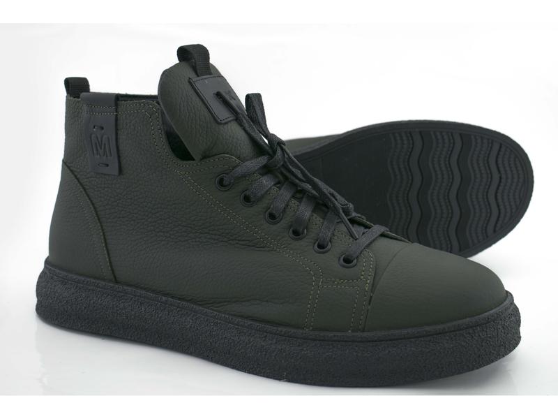 Практичные и удобные мужские ботинки из мягкой натуральной кожи в цвете темного хаки. Обувь утеплена плотной овчиной, на шнуровке. Украина, кожа, хаки, зима, шерсть