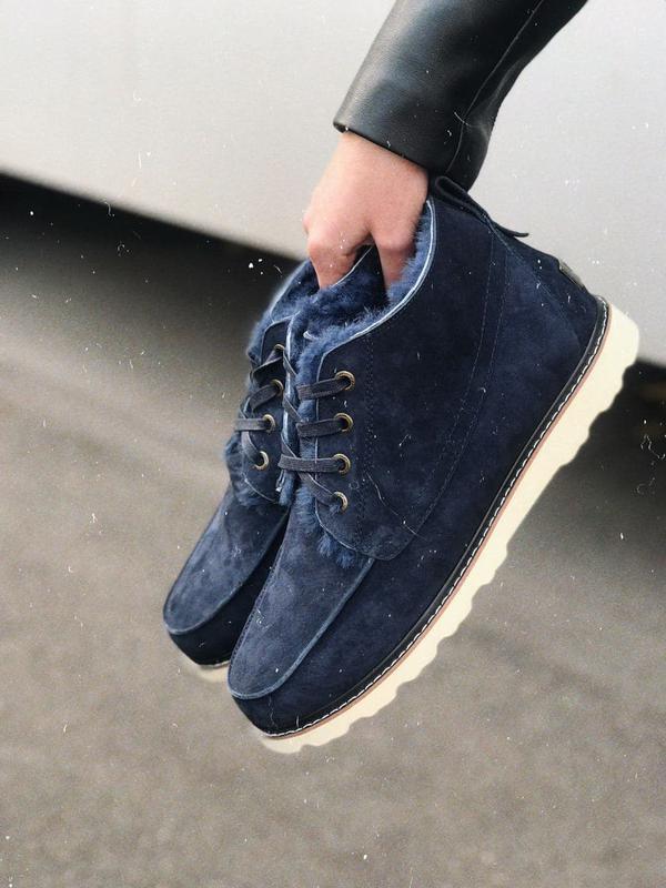 Кілька примірників у наявності Матеріал:натуральна замша , натуральне хутро Устілка натуральне хутро Кожна пара оброблена водовідштовхувальним складом, який запобігає всмоктуванню вологи. Підошва : EVA ( не ковзає , не пропускає холод ) Розміри:40(25.5) 41(26) 42(26.5) 43(27.5) 44(28) 45(29) см