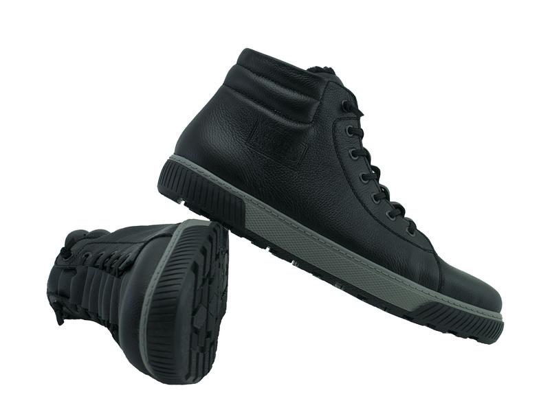 Спортивные зимние мужские ботинки немецкого производства, выполнены из натуральной кожи в чёрном цвете. Утеплены овчиной, змейка с внутренней стороны функционирует. Внутри стелька комфорт антистресс. Подошва антискользящая, выполнена из резины. Германия, натуральная кожа, чёрный, зима, овчина