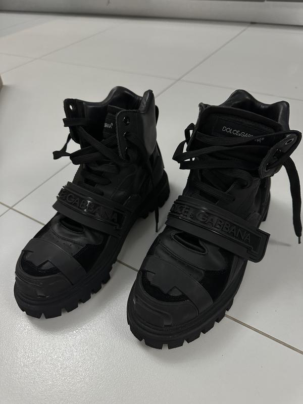 ботінки Dolce & Gabbana, стильні та універсальні, чорного кольору. • Розмір: 42 • Стан: Відмінний • Матеріал: Натуральна шкіра з гумовими вставками • Особливості: • Фірмовий логотип Dolce & Gabbana на ремінці • Міцна та рельєфна підошва, ідеальна для міського середовища • Зручна посадка завдяки шнурівці та ремінцю Ботінки чудово підходять для повсякденного носіння та стильних образів. Вони поєднують комфорт і сучасний дизайн. Ціна: 8 000 грн Для уточнення деталей або покупки пишіть у приват.