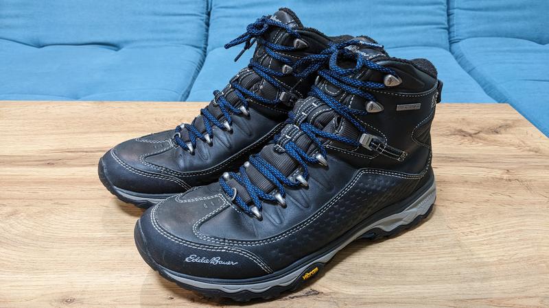 Продаю черевики Eddie Bauer Mountain Ops Hiking Boots Carbon, розмір 43/US 10 Стан: Нові, оригінал, куплені в Штатах на офіційному сайті Eddie Bauer Розмір: 43 (US 10, устілка 28 см). Колір: Carbon (темно-сірий/чорний). Матеріали: Верх із водонепроникної суцільнозернової шкіри преміумкласу, водовідштовхувальна мембрана WeatherEdgeTM для захисту від вологи та снігу. Технології: - WeatherEdgeTM: Водонепроникна та повітропроникна мембрана для сухості ніг. - ThinsulateTM 100 г: Легка ізоляція для тепла в холодну погоду (до -10 °C). - Vibram® Ice-Trek: Гумова підошва для надійного зчеплення на слизьких і нерівних поверхнях. - MidLite EVA: Проміжна підошва з EVA для легкості, амортизації та підтримки. Дизайн: Класичний похідний стиль, підходить для зимових прогулянок, легких походів і повсякденного носіння. Легкі (приблизно 1.5 кг за пару), зручні для тривалого носіння, зокрема за кермом. Комфорт: Анатомічна устілка та щільна посадка забезпечують стійкість і комфорт. Eddie Bauer Mountain Ops — ідеальний вибір для зимових прогулянок, походів перетятою місцевістю або міських умов. Черевики забезпечують тепло, захист від вологи та чудове зчеплення, зберігаючи стильний вигляд. Міцна конструкція та якісні матеріали гарантують довговічність. Підходять для помірних погодних умов (відклики підтверджують комфорт за 26-34 °F).