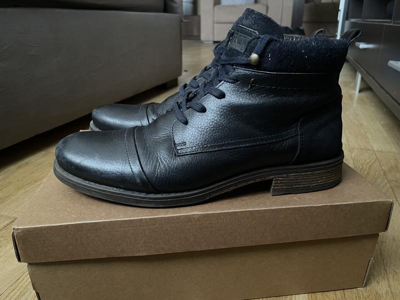 Бренд Respect Шкіра зі вставками натуральної замші Шкіра чорного кольору, замша темно-синього На носу потертість, чорним кремом для взуття прибереться Повний 43 розмір