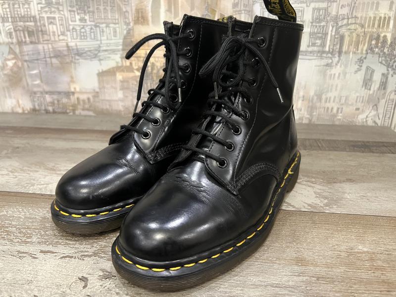 Вінтажні черевики від Dr. Martens класичного дизайну на 8 люверсів. Модель вироблена у Великобританії ще до переміщення компанією виробництва до Китаю та інших країн Азії, тому якість гарантована. Розмір: орієнтовно 40-41 (на ногу близько 26 см) Матеріал верху: натуральна шкіра. Колір: чорний Стан: дуже хороший, присутні неглибокі подряпини, які не помічаються при носінні та тільки додають цьому взуттю брутальності. Також варто відзначити їхню розхоженість, вони вже не будуть натирати при ходьбі, як нові, якщо розмір підібраний правильно. Щодо додаткових питань буду радий відповісти в особисті.