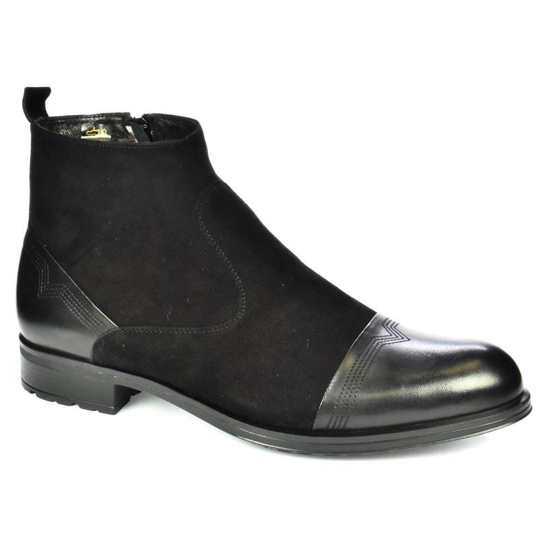 Чоловічі модельні черевики на блискавки з натуральної замшої чорного кольору комбінована з натуральною шкірою, підкладка зроблена з натурального матеріалу вовна. Підкладка і стелька з натуральної вовни (цигейка), легка і гнучка підошва.