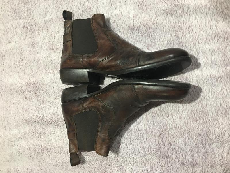 Рарітетні міцьні і якісні черевики челсі -унісекс/ Розмір великий/ Підбори квадратні невисокі/ Шкіряні з узорами/ З боків широкі гумки і ремінець/ Класичні темно коричневого кольору/ Річь ексклюзивна-рарітетна/ З нюансів-місцями є незначні потертості на фото вказано,у ціні враховано,продається як є без повернення/ Устілька 29 від самого носика/ Підійде на розмір 42-43/ Загальна висота 15,8 см/ Висота підбора 3,3 см/ Ширина підошви 10,6 см/ Натуральная кожа прекрасно выдерживает многократные сгибания и растягивание. Обувь из нее прочна и надежна. Износостойкость. Если купить кожаную обувь, она прослужит вдвое, а то и втрое дольше, чем изделия из искусственных аналогов.