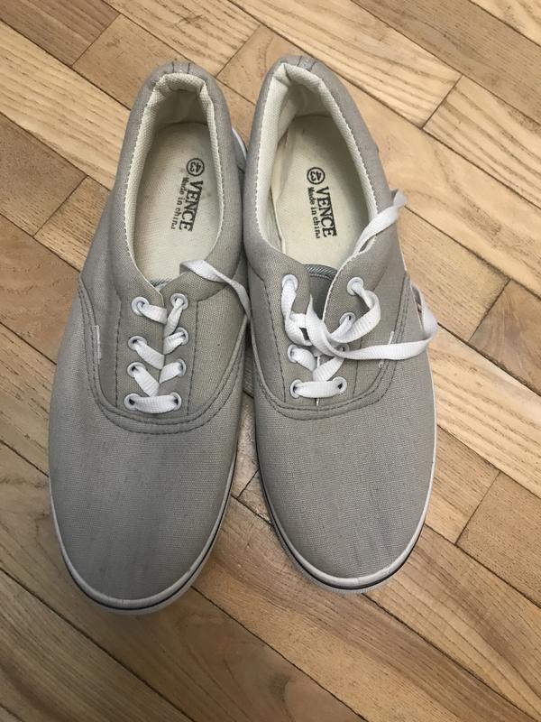 Чоловічі кеди світло-сірі. Верх - тканина натуральна. Стан відмінний. Були взутті два рази. На жаль, позаду відліпилися наліпки бренду (фото додала). Устілка 26 см.