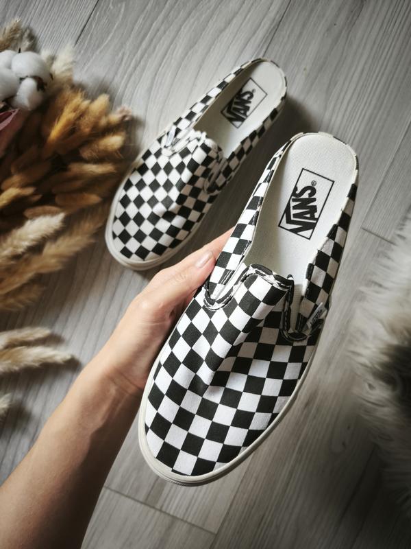 Мюлі сліпони Vans Classic Slip-On Checkerboard. Це культова модель, яка стала символом каліфорнійської скейт-культури. Модель: Vans Classic Slip-On Checkerboard. Колір: чорно-білий шаховий візерунок. Матеріал верху: міцний текстиль (канвас). Підошва: фірмова гумова вафельна нові розмір 40 устілка 26см замовлення по мінімальній передоплаті 200грн, оплата на карту, також можете оформляти безпечну доставку укрпоштою (новою поштою безпечною оплатою не відправляю)💌