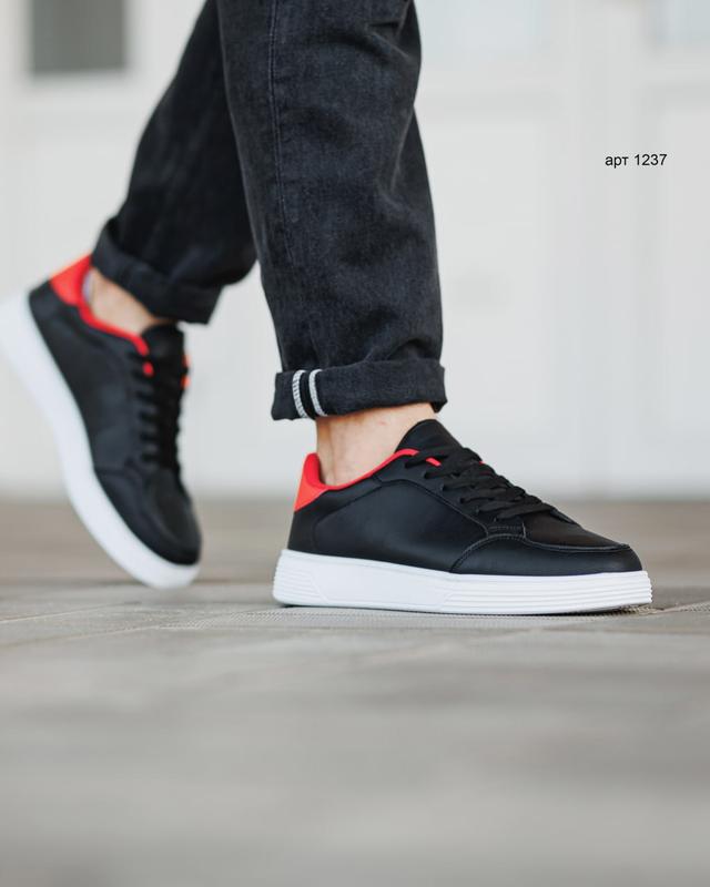 Арт: 1237 Розміри в наявності: 41-26см, 42-26.5см, 43-27.5см, 44-28см, 45-28.5см, 46-29см Матеріали: Верх - штучна шкіра. Підошва - пінка. Опис: Чорні класичні кеди на білій підошві з червоним задником, красиво та стильно виглядають та мають бути в кожного! Чудовий варіант як на вихід, так і на кожен день. Пасуватимуть до будь-якого верхнього одягу. Зручні та дуже легкі.