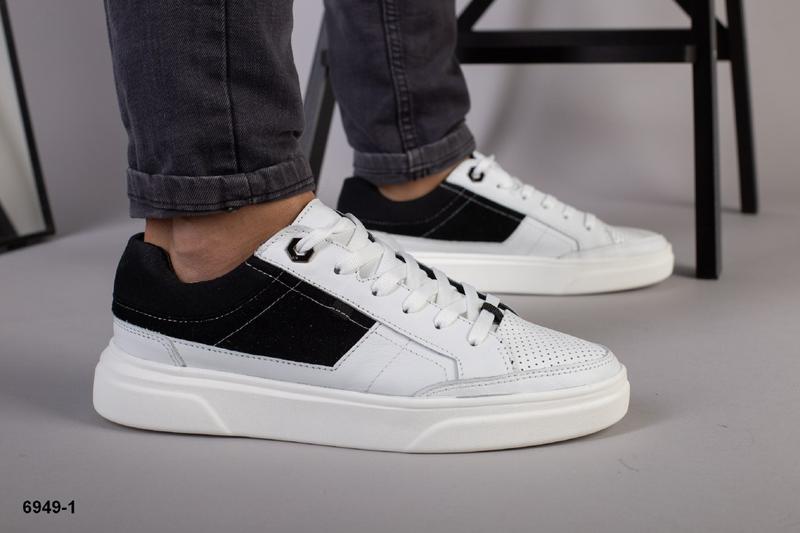 Код: 6949-1 Чоловічі кеди зі шнурівкою сезон: весна-літо матеріал: натуральна шкіра + натуральна замша+ текстиль всередині: шкіряна підкладка розміри: 39-45 колір: білий+чорний підошва: 2,5-4 см висота без підошви: 6,5 см виробник: Украина Ціна: 1500 грн