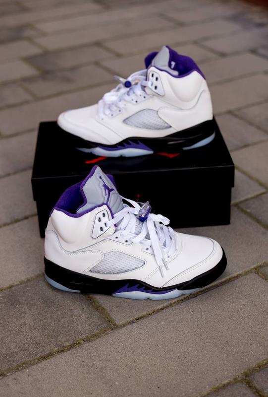 Чоловічі шкіряні кросівки νike air jordan retro 5. колір білий з фіолетовим.