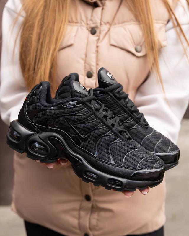 Nike Air Max Plus Tn Black NK099 Матеріал: верх - синтетичні водонепроникні матеріали; підошва - піна, гумовий протектор, всередині - подушка Air Max. Розміри: 36 (22,5 см), 37 (23,0 см), 38 (23,5 см), 39 (24,0 см), 40 (25,5 см), 41 (26,0 см), 42 (26,5 см), 43 (27,5 см), 44 (28,0 см), 45 (29,0 см), 46 (29,5 см) Комплект: оригінальна коробка + брендовий папір