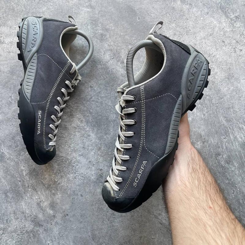 Scarpa Mojito 📏40.5-41 (26 см) 💰1600 грн — популярна модель трекінгово-повсякденного взуття італійського бренду Scarpa. Виготовлені зі замші з гумовим обтягуванням носка та п’ятки, з агресивною підошвою Vibram. Ідеальні як для міста, так і для легких походів.