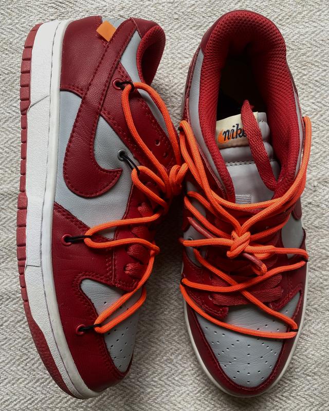 Продаю оригінальні кросівки Nike Dunk Low x Off-White "University Red". Розмір: 41 EU Стан: дуже хороший, носилися акуратно, без пошкоджень чи потертостей. Усі фірмові елементи на місці — шнурівки, деталі Off-White, бірка. Коробки, на жаль, немає — кросівки купувалися не новими