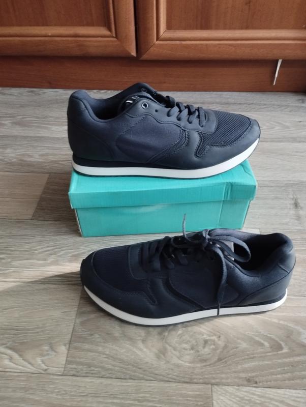 нові кросівки з текстилю та вставками зам шкіри.розмір 43.на шнурувці.низька підошва.Кольру темно синього.Дов уст27.5см шир 10см.Висота задника9см.Без дефектів.