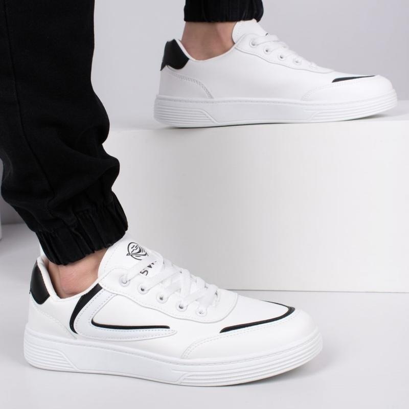 Чоловічі білі кросівки на шнурівці Матеріал верху: Екошкіра Матеріал устілки: Екошкіра Колір: Чорно-білий Вид застібки: Шнурівка Сезон: Весна/Осінь