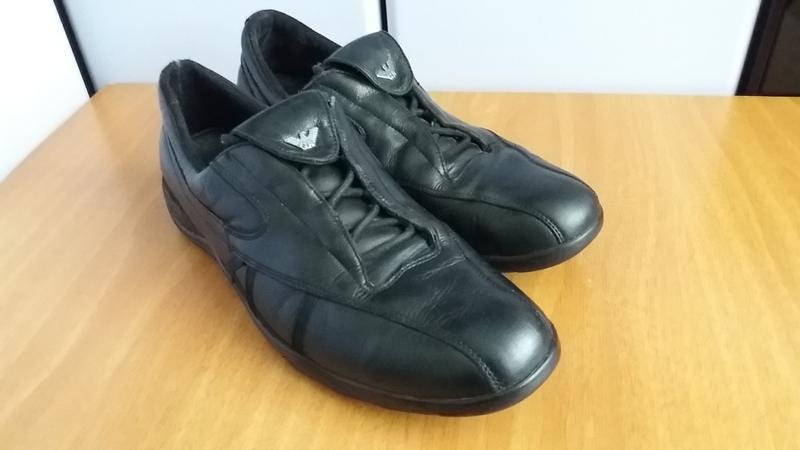 Туфлі - мокасини Armani Jeans з м'якої натуральної шкіри чорного кольору. Застібка - шнурівка, яка прикривається шкіряним язичком з логотипом Armani. Всередині поролоновое утеплення. По устілці 29 див. Стан нормальний, видно на фото. Взуття з Англії.