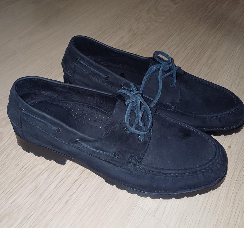Топсайдери Thursday , розмір 47 або 13. По устілці 31 см. Дуже міцні та зручні черевики Thursday. Виготовлені із чорного матового набука. Фірма Thursday Boot – американська фірма, що виготовляє черевики ручним способом. Їхній девіз - максимум якості та зручності за чесні гроші. Їхня продукція ніколи не знижується і не потрапляє на розпродажі. Фірма є одним із конкурентів Red Wing. Верх черевиків – натуральна шкіра, підкладка – натуральна шкіра, підошва – гума. Стан новий.