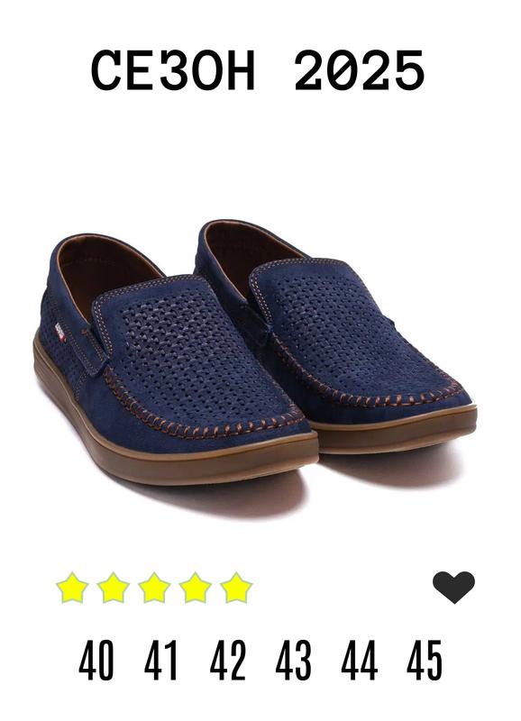 Код моделі: 97 син/н перф Матеріал верху: натуральна шкіра(нубук) перфорація Матеріал підкладки:текстиль Матеріал устілки:текстиль Матеріал підошви:ТЕП Сезон: весна, літо, осінь Розмірна сітка: - 40 - 26,0 см - 41 - 27,0 см - 42 - 28,0 см - 43 - 28,5 см - 44 - 29,0 см - 45 - 29,5 см