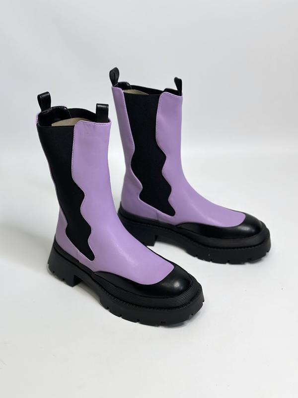 🔻розмір: вказаний: 38 🔻заміри: 👉. 24-24,5см 24-24,5 см 24-24,5 см 24-24,5 см каблук - 4 см ширина устілки - 8,5 см высота Повна - 28 см ширина зверху- 15 см 🔻стан: нові 🔻матер‘ял : еко шкіра 🔻утеплювач : синтипон на підкладці 🔻колір : чорні/бузкові