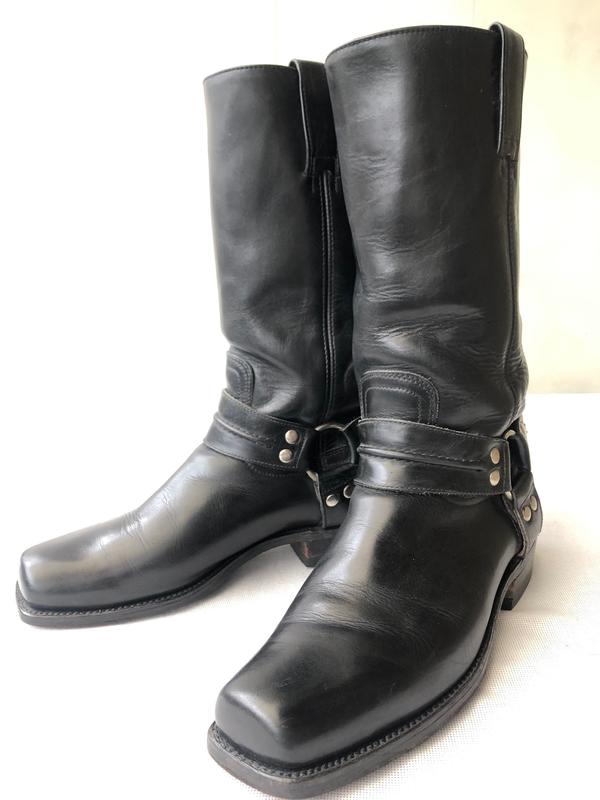 Мощные черные кожаные байкерские сапоги известного испанского бренда Sendra Классика жанра Толстая натуральная кожа, массивная подошва, тяжёлые - пара весит 1,84кг Метод крепления верха к подошве - Goodyear Изготовлено в Испании Размер на внутренней стороне голенища указан 10 Судя по замерам - на наш 43-й По внутренней стельке - 28,5 см СОСТОЯНИЕ: Вещь б/у, имеются незначительные следы эксплуатации, но, учитывая качество материалов, практически неубиваемы Заводские набойки имеют минимальный износ (см. фото)