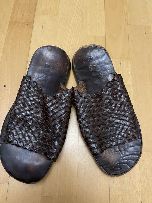 Шлёпанцы из плетённой кожи шоколадно- коричневого цвета. Размер 44, стелька 29,5 см, ширина стельки 10,5 см. Подошва практически не изменена. Дефекты - см. Фото. Можно подкрасить кремом места, где краска стерлась, отклеена 1 тонкая полоска на 1 шлёпанце.