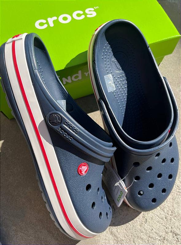 Crocs Crocband Navy – класичні сабо з легкого матеріалу Croslite, у темно-синьому кольорі з контрастною білою смужкою по підошві. Мають вентиляційні отвори, зручний поворотний ремінець на п’яті та легко миються. Ідеальні для щоденного використання вдома, на вулиці чи біля води.