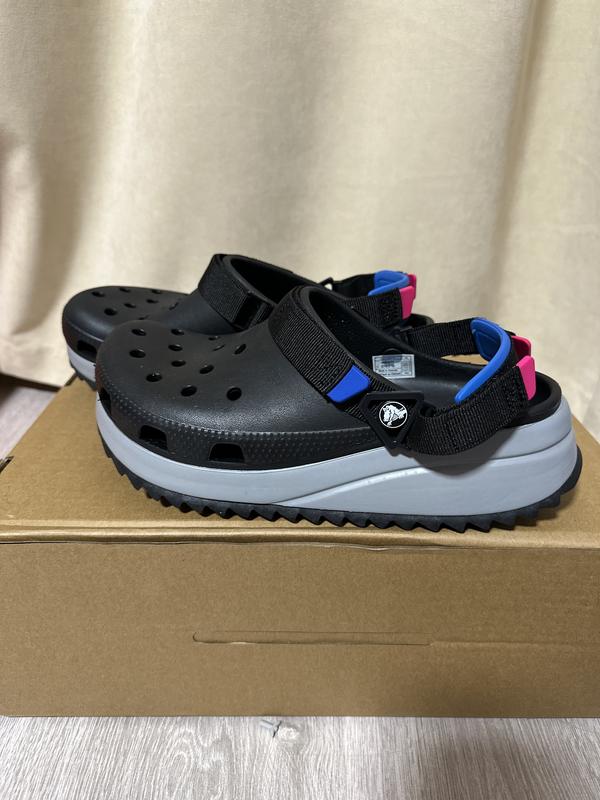 Особливості Classic Hiker Clog: Верх і посадка відповідає нашим класичним сабо Конструкція з двох елементів з оновленим дизайном межподошви і підошви Висота межподошви більше на 10 мм для більш «збільшеного» трендового стилю Межподошва виконана з матеріалу Croslite Рельєфна підошва з гумовою смугою по периметру для кращого зчеплення з поверхнею Поворотний п'ятковий ремінець, регульований за допомогою застібок на липучках Піднімається ремінець, регульований за допомогою застібок на липучках Можна прикрасити Jibbitz ™ Iconic Crocs Comfort ™: Легкі. Гнучкі. абсолютний комфот 42/43 m8/w9