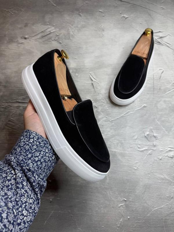 Чоловічі сліпони мокасини лофери чорні замшеві на білій підошві з натуральної замші 8050