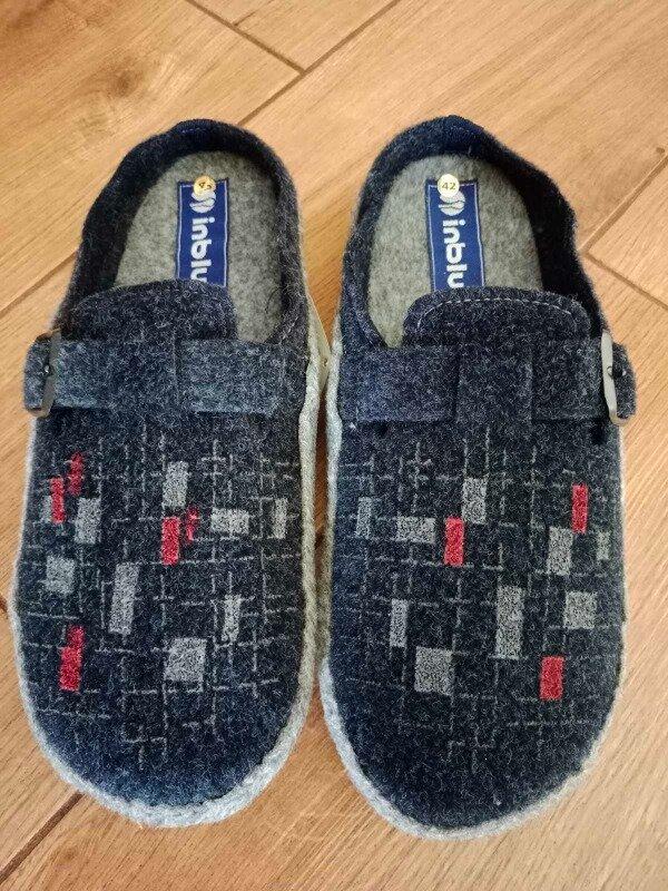 М"які , безшумні, теплі. Підходят для ламіната та паркета. Матеріал фетр. На поідошвеі шорсткий напис, що б не ковзали по підлозі. р. 43 - 27.5см р. 44 - 28 см