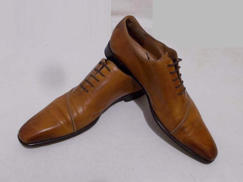 Туфлі в чудовому стані: верх майже ідеальний, шкіряна підошва посилена PU ребрами жорсткості трохи стерту під стопою, підбори складані з дуже міцного матеріалу, тому форма майже як у нових. Повністю шкіряні розкішного коньячного кольору. Шарма додає оригінальної, дуже гарної форми декоративної рулки біля шва. На оф сайті подібні туфлі стоять 340 м Устілка 32х9,5 см (носок звужений), каблук 2,7 см. Бренд чоловічого взуття Magnanni — це історія сімейного бізнесу, який зумів змінити світ моди. Сьогодні в керма компанії вже третє покоління Альдомар, що передає один одному традиції виготовлення взуття вручну. Замість верстатів і механізації виробництва в Magnanni зробили вибір у бік унікальності своєї продукції. В основі виробництва черевиків і туфель для чоловіків ось уже 50 років лежать три принципи: перш за все, спосіб виготовлення — уже йдеться про ручну працю. Крім того, як вихідна сировина в Magnanni використовується шкіра найвищої якості — за його стандартами стежить вся родина. Нарешті, третє складене успіху — оригінальний дизайн: фахівці марки знають, як подати класику у світі сучасної моди. Увага до кожної дрібниці та гарантії якості забезпечили Magnanni місце в fashion-індустрії. Крім монобрендових бутиків у всій Іспанії, купити взуття цієї марки можна далеко за межами країни-виробника. Черевики ручної роботи Magnanni популярні в країнах, де покупці вимогливі та знаються на моді — у Франції та Італії.