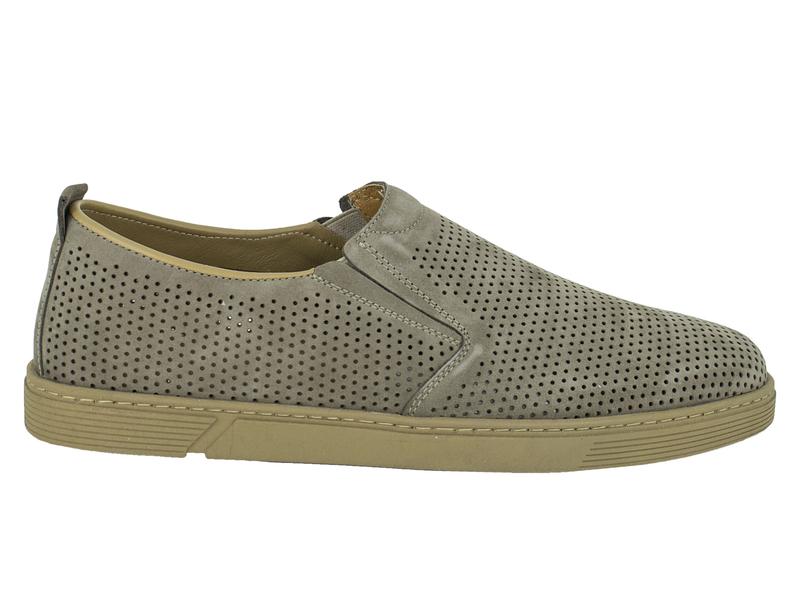 Комфортные мягкие мужские летние туфли украинского производства. Выполнены из нубука в бежевом цвете. По бокам есть резиновые вставки.