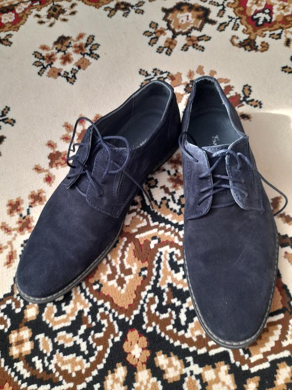 Темно сині замшеви туфлі в гарному стані фото не передає стану замша.Довжина устілки 26.5-27см.Обувались декілька раз ,нога швидко виросла.
