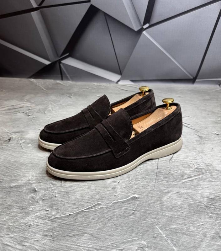 Чоловічі лофери замшеві шоколадного кольору стильні туфлі мокасини коричневі натуральна за...