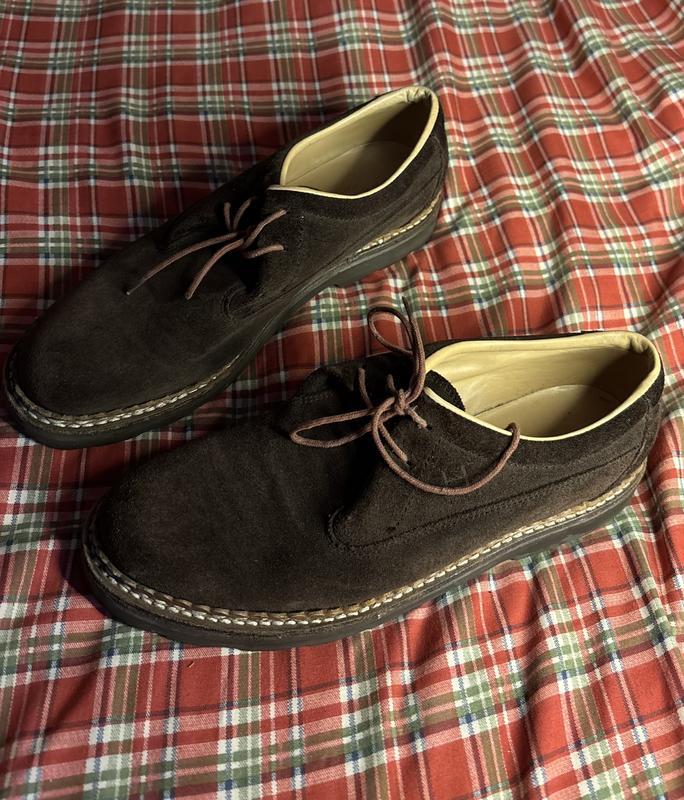 25,7 стелька Hardrige — це марка взуття, заснована в 1980-х роках у Франції, відома ручним пошиттям за традиційними методами Goodyear та Norwegian welt (понад 150 операцій на пару). Вони використовують якісну шкіру з французьких дубильних фабрик і часто роблять акцент на міцних підошвах з натурального каучуку (caoutchouc naturel — це французькою “натуральний каучук Замшева шкіра (suede) темно-коричневого кольору, з жовтою шкіряною устілкою. • Стиль: Чоловічі дезерти (desert boots) або челсі-стиль з шнурівкою, з гумовою підошвою для кращого зчеплення та захисту від вологи